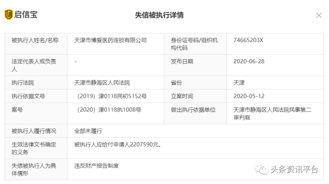 不久前,该公司还被法院冻结了50万元的资金。据《保定蕴鑫建筑工程有限公司、天津市博爱医药连锁有限公司合同纠纷执行实施类执行裁定书》显示,在申请人保定蕴鑫建筑工程有限公司与被申请人天津市博爱医药连锁有限公司合同纠纷一案中,保定市莲池区人民法院冻结被申请人天津市博爱医药连锁有限公司银行存款人民币500000元或查封、扣押其等值的财产。