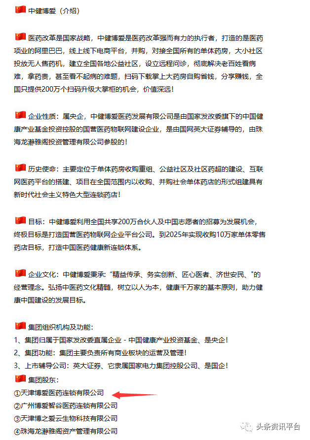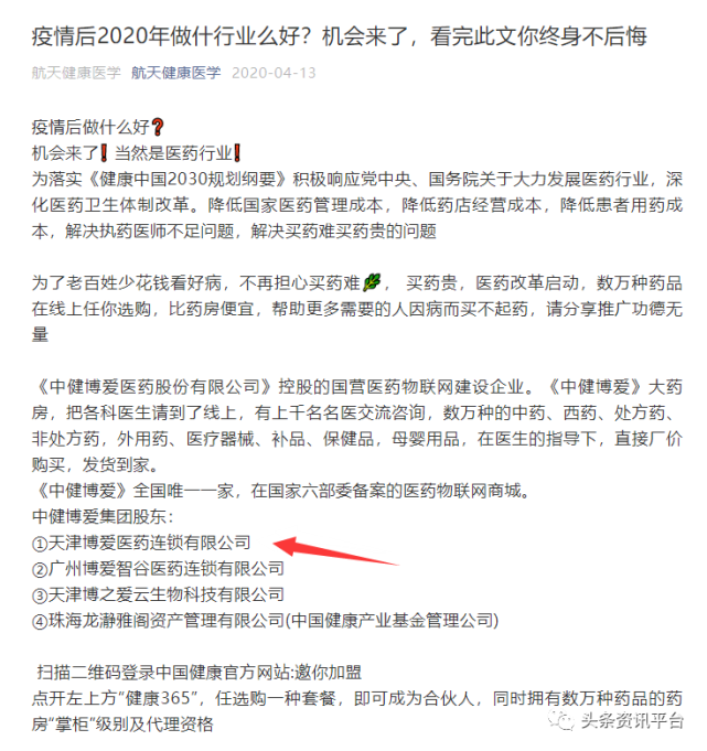 关于公司股东方面,公众号“航天健康医学”的宣传,看来也是大同小异。另有资料显示,中健博爱医药集团旗下子公司已与天津博爱医药连锁有限公司等企业达成了战略合作关系,为中健博爱医药集团旗下连锁药房,线上APP博爱掌上药房提供运营及服务保障。