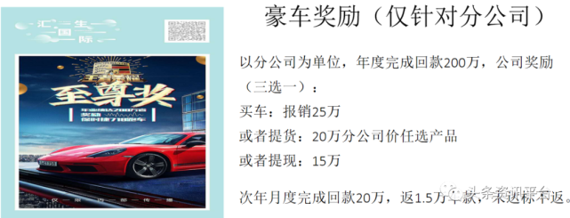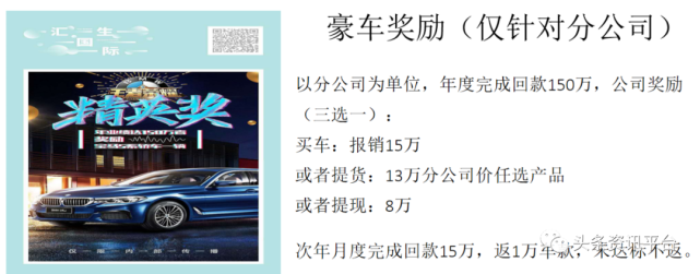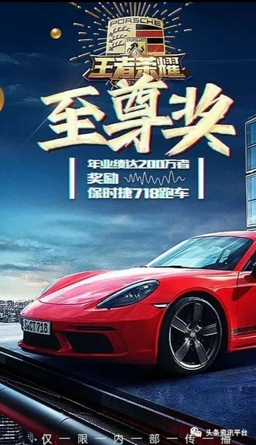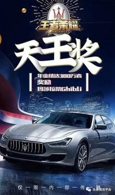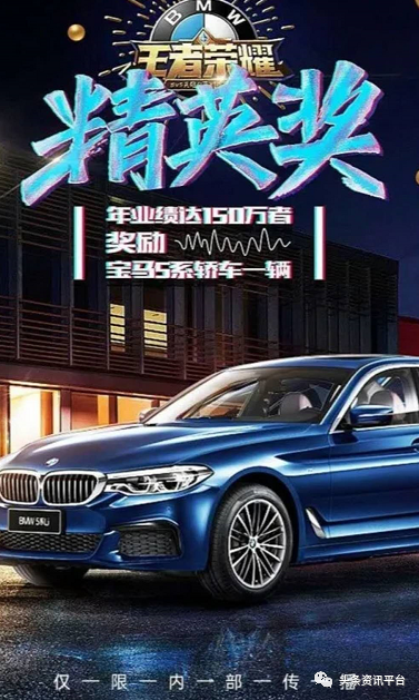 此外,分公司还有豪车奖励可拿,年业绩达到150万元,奖励宝马5系轿车一辆;年业绩达到200万元,奖励保时捷718跑车;年业绩达到300万元,奖励玛莎拉蒂Ghibli。