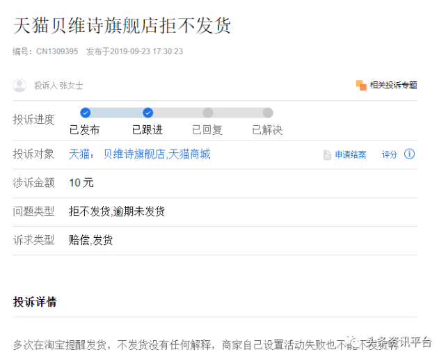 顺带一提,在聚投诉平台上,还有网友对贝维诗旗舰店发起了投诉,张女士声称:“天猫贝维诗旗舰店拒不发货”。