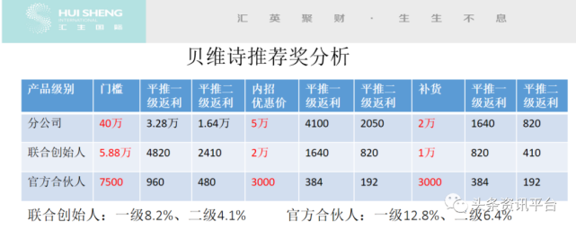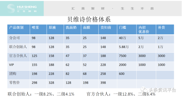 说完了产品,再来看看制度。贝维诗方面将代理商分为了以下五个级别,分别是分公司,联创、官方、VIP和团购。