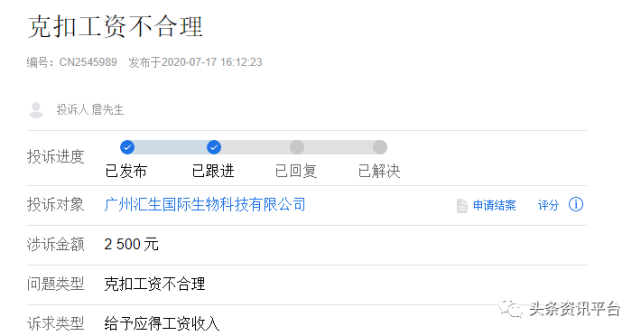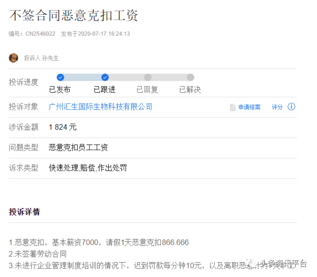 日前,在聚投诉平台上,关于汇生国际公司的投诉已经开始发酵。2020年7月17日,网友詹先生对该公司投诉称:“克扣工资不合理”,詹先生表示他在广州汇生国际生物科技有限公司的策划部实际上班13天,而到手的工资却只有不到1200元。