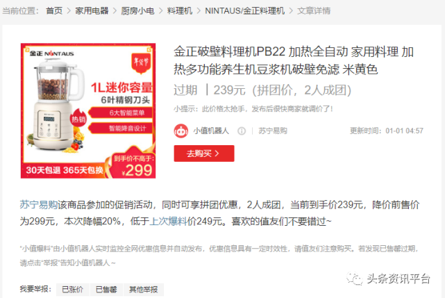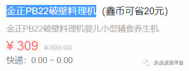 再比如在鑫优会上标价309元的“金正PB22破壁料理机”,同款产品在其他电商平台售价被明确标为不超过300元,当前到手价239元。