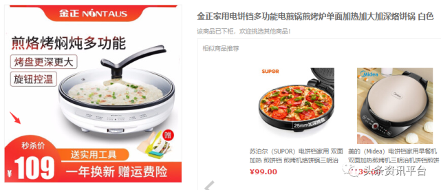 不过在这些平台的宣传图片中,还是能让我们看到同款产品在此前的标价。我们以型号为“JZK-167-FS”的“金正家用电饼铛多功能煎烤炉”为例,该产品在鑫优会上的售价为119元,而同款产品在京东上下架前的秒杀价为108元。