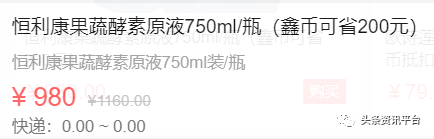 值得注意的是,恒利康酵素中国区旗舰店划掉的市场价也正是鑫优会的标价980元,那么鑫优会为该产品划掉的、高于市场价的1160元又是从何而来呢?