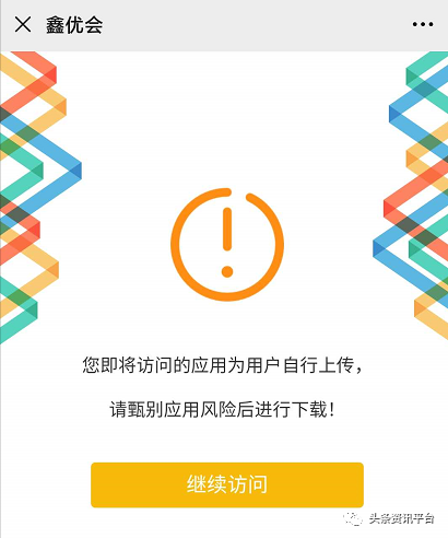 再说回商城本身。在进入宁波新观念网络科技有限公司的官网后,会有相应的弹窗提示用户下载鑫优会的APP。但用户在扫描官网中的二维码后,移动端的页面会提示“您即将访问的应用为用户自行上传,请甄别应用风险后进行下载”。