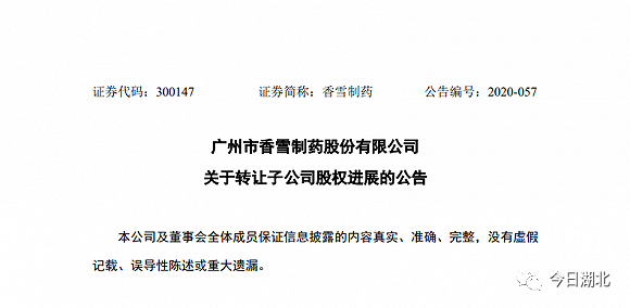 2019年12月31日,香雪制药股份有限公司发布《关于转让子公司股权的公告》。公告称,为进一步聚焦主营业务的发展,整合优化资产结构及资源配置,提高资产流动性及使用效率,增强核心竞争力,公司拟将部分资产剥离后的广东九极生物科技有限公司100%股权,以9000万元转让给广州淡水泉资产管理有限公司。