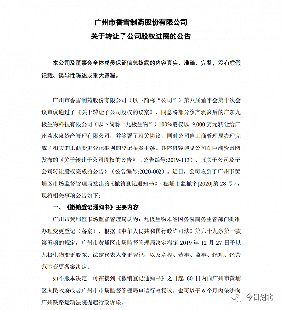在广州市香雪制药股份有限公司发布关于转让子公司股权进展的公告提到,因九极生物未经国务院商务主管部门批准办理变更登记(备案),广州市黄埔区市场监督管理局决定,撤销2019年12月27日予以九极生物变更股东、法定代表人变更登记,以及章程、董事、监事、经理、经营范围变更备案决定。