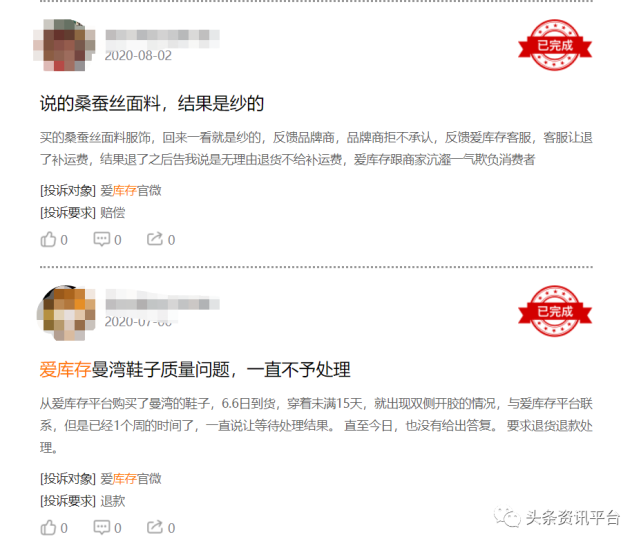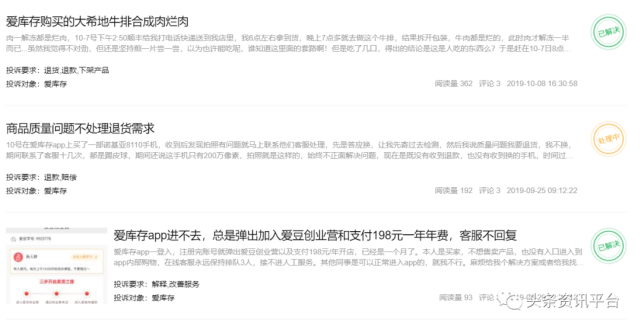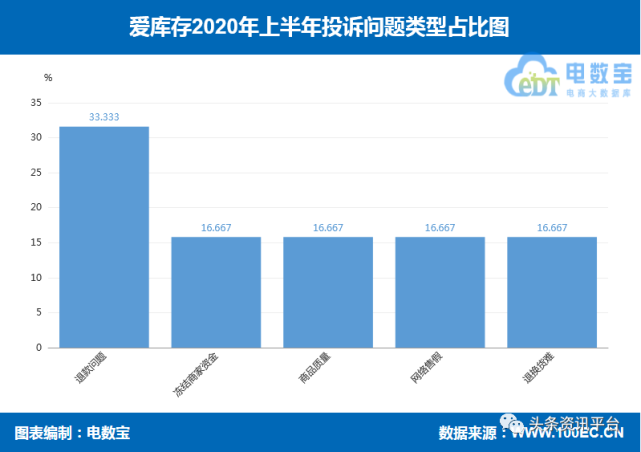 此外,据国内电商专业消费调解平台“电诉宝”数据显示,“爱库存”主要存在退款问题、冻结商家资金、商品质量、网络售假、退换货难问题。
