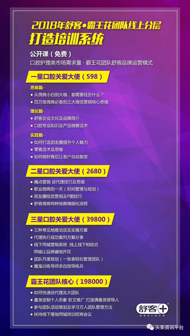 分别是一星口腔关爱大使(598元)、二星口腔关爱大使(2680元)、三星口腔关爱大使(39800元)、霸王花团队核心(198000元)。虽说如此,不过我们在原舒客代理商的朋友圈中,依然能看到带有五星口腔关爱大使头衔的参与者。