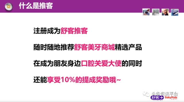 据了解,对于目前的舒客来说,虽然没了微商代理模式,不过还有经销商模式、员工模式和推客模式。经销商上面提到过了,就是线下实体,员工就是推销产品,和销售类职位差不多,下面说说线上的推客,据资料显示,舒客的推客可以享受到百分之十的提成奖励。