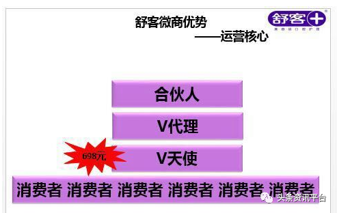 据公开资料显示,起初,舒客微商推行的是合伙人、v代理和v天使三级代理模式,最低门槛是698元。