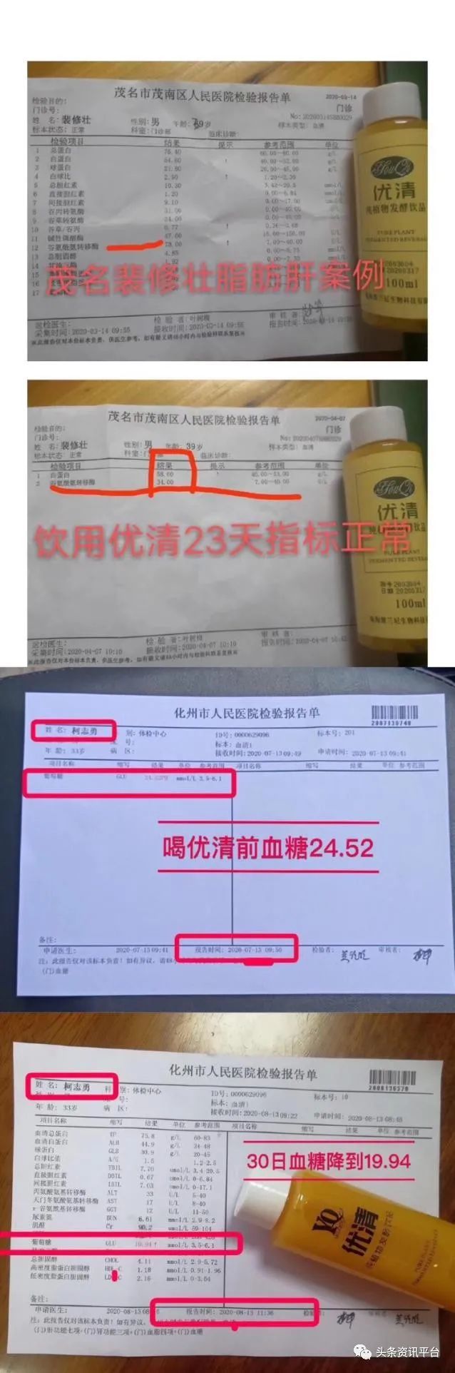 “来自珠海的范大姐喝优清前谷丙转氨酶41,甘油三酯3.42,喝优清后一个月谷丙转氨酶27,甘油三酯1.79,都回到了正常值。”