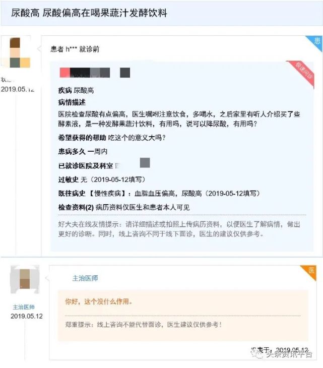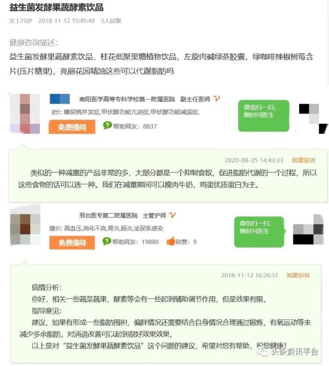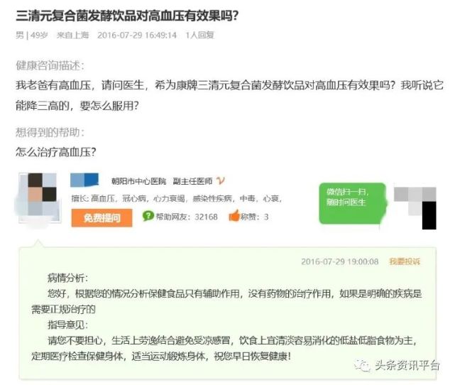 除此之外,在网上我们也看到有消费者向医生咨询此类发酵饮品在减肥、降血压、降血脂方面的效果,对此,医生的回复都是没什么太大的用处,或者通过合理的饮食和锻炼来进行辅助调节,当然最好还是接受医院正规的治疗。
