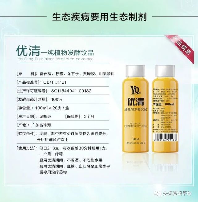 根据调查我们了解到,优清的生产许可证号为SC11544041100182,而该生产批准文号只是食品生产许可企业文号,这也意味着优清属于食品类别中的饮料,而并不是所谓的可以治病的药物。