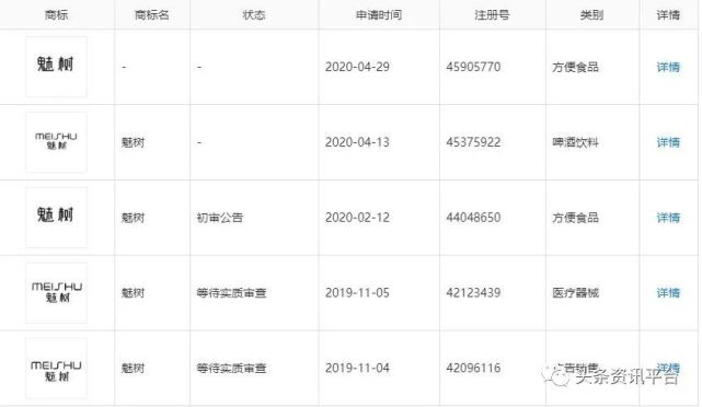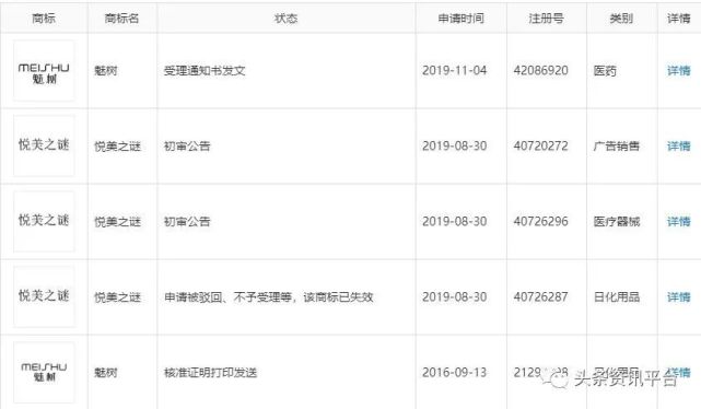据启信宝显示,该公司在成立之后前前后后申请了一系列关于魅树和悦美之谜的商标,而这些商标中的大部分到现在都还没有顺利完成注册,其中,类别被标注为日化用品系列的“悦美之谜”的商标状态还处于“申请被驳回、不予受理等,该商标已失效”的阶段。