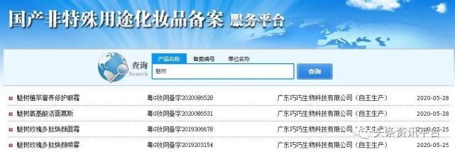 先说化妆品板块,经查国产非特殊用途化妆品备案平台,我们发现魅树旗下多数化妆品的生产方基本上都为广东巧巧生物科技有限公司。