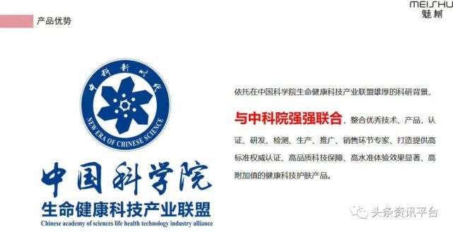 一个品牌要想发展得长久,光有“人和”还不够,还需要“天时”与“地利”,而说到公司的实力与背景,魅树旗下产品与中科院合作之事自然不得不提,中科院这三个字也成为了不少魅树经销商的背书资本。