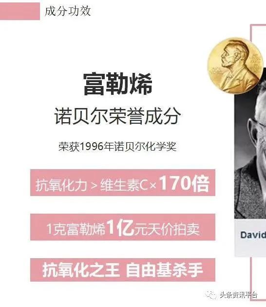 该产品内含的多种成分也遭到了各种资料的着重宣传,除了号称可以增强免疫系统功效的“谷胱甘肽”之外,还有号称“抗氧化之王”的“富勒烯”。