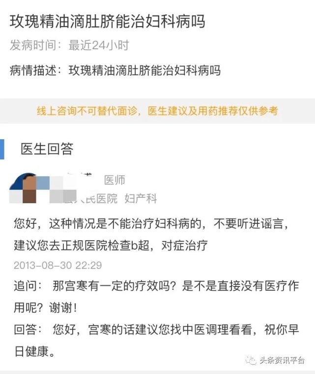 对于此类产品,还有消费者线上咨询相关医生询问其功效,诸如将玫瑰精油滴在肚脐是否能够治疗妇科病,玫瑰精油是否能够淡化疤痕和痘印等,对此医生的答复都是该产品没有医疗作用,建议到正规医院接受治疗。