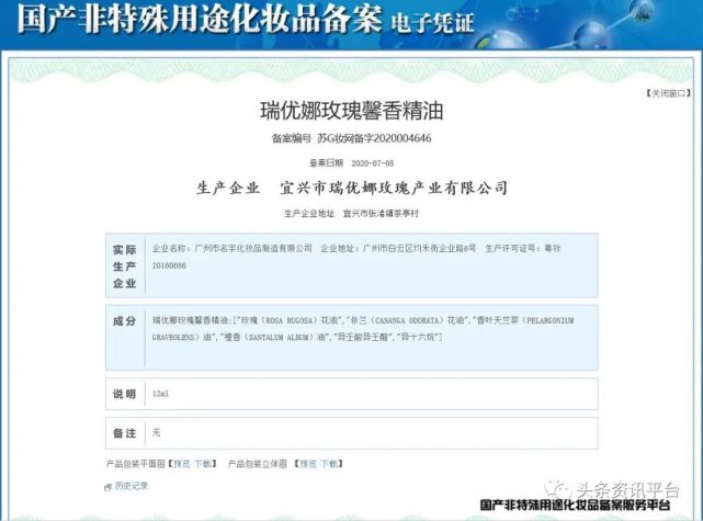而我们在查询的过程中发现,这款瑞优娜玫瑰馨香精油属于国产非特殊用途化妆品范畴,生产许可证号为粤妆20160686,实际生产企业为广州市名宇化妆品制造有限公司。
