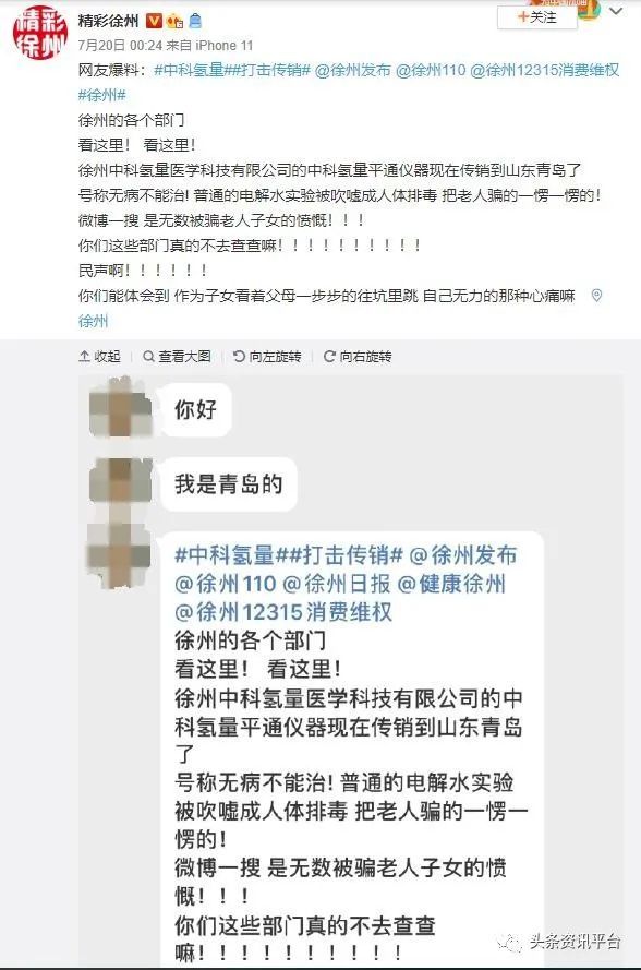 还有网友在哔哩哔哩专栏上以《中科氢量平通仪——早该结束的骗局却延续至今?》为题发表文章进行曝光,并在文中分享出了他的所见所闻:据我亲戚跟我讲的,卖她仪器的人也不是销售商,而是中间人,卖家先骗人,然后把被骗的人发展为销售者(不知道实情,以为有用),然后被骗的人又骗了别人(也不能算骗,毕竟有好东西自己人肯定会分享),以此类推,骗子就发展了很多下线。而且这种卖家没有固定的店铺,用游离的方式售卖,四处骗钱。