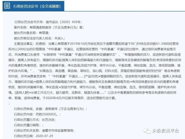 此外,当事人还向消费者发放产品具有治病功效、以及水中毒素颜色的辨别参考等含有虚假内容的传单,欺骗、误导消费者,于2020年4月29日被诸暨市市场监督管理局查获,违法经营额无法计算,最终,有关部门决定对当事人处以罚款250000元。