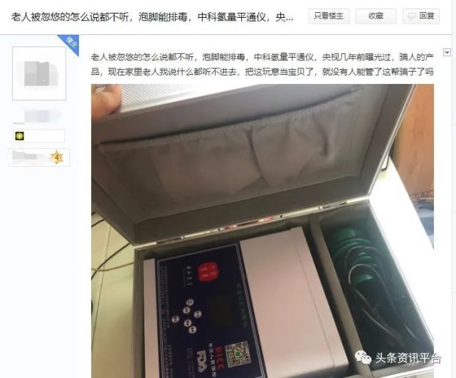 近年来,“泡脚排毒仪”忽悠老人的事件在全国各地屡次上演,在屡遭媒体曝光后,反而还有愈演愈烈的趋势,最先见诸报端的“泡脚仪”骗局可以追溯到十五年前,当时被曝光的产品名称为“排毒基强离子排毒仪”。为避免类似骗局只要把仪器改个名称就能周而复始地登堂入室的乱象继续发生,广大消费者既需要在科普节目和文章中得到生活常识的普及,也要提高对所谓“养生仪器”的警惕与辨识度,相关监管部门更需要加大力度查处带有虚假宣传性质的违规宣传行为。