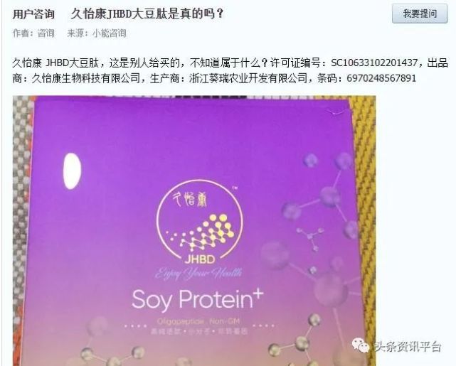 经过进一步的调查,我们发现挂着久怡康牌子的大豆肽小分子肽等产品根本就不是保健品,只是普通食品。围绕着该产品,在网上流传着三种生产许可证编号。