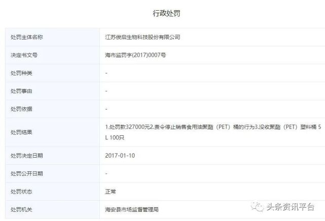 顺带一提,除了浙江葵瑞农业开发有限公司,蓝飞集团还投资了江苏俊启生物科技股份有限公司(据久怡康官网显示,久怡康的总部所在地就是江苏俊启生物科技股份有限公司)。而该公司曾遭到海安县市场监督管理局的行政处罚:1.处罚款327000元;2.责令停止销售食用油聚酯(PET)桶的行为;3.没收聚酯(PET)塑料桶(5L)100只。