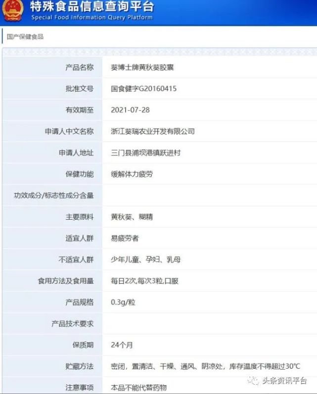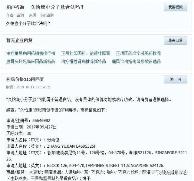 在咨询药品价格315网之后,我们发现上述国食健字G20160415对应的产品为葵博士牌黄秋葵胶囊,保健功能为缓解体力疲劳,生产厂家为浙江葵瑞农业开发有限公司。可见,这款拥有蓝帽子资质的产品虽然与久怡康有关,但并非久怡康旗下的肽类产品。