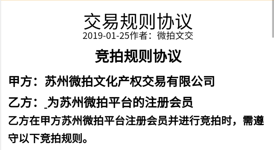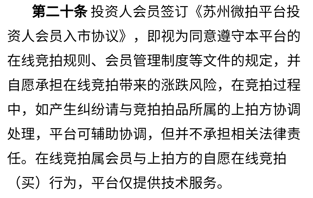 《微拍平台交易规则》第十章第五十三条:由于在市场异常情况下采取相应措施所造成的损失,本中心不承担任何责任,会员自由竞拍交易,所有拍卖成功的拍品,会员可以在改拍品的有效期内选择是否再次上拍交易,微拍文交平台并不保证一定可以再次上拍成功,如出现流拍均为市场行为,如果不能上拍成功的拍品,最终会员需存在直接提货。在线拍卖交易,价高者得,请自觉承担价格波动涨跌风险,平台不做任何承诺性收益几汇报,会员请自愿选择出价竞拍及交易,包括通过除权模式在一级半市场倍增奖励活动进行的协议转让交易方式及进入二级市场采用并票方式进行的二级市场每竞买15笔释放一票一级半市场活动票均为市场化自由涨跌竞拍交易(详见各产品公告),均为会员自行承担因此带来的任何价格波动及风险。因不可抗拒因素及政策原因造成的相关影响,平台不承担由此带来的风险,会员可选择拍品提货交割。平台自营电商产品,采用即购买即提货的模式,后期仅提供平台交易,不承诺任何收益几涨跌保障。