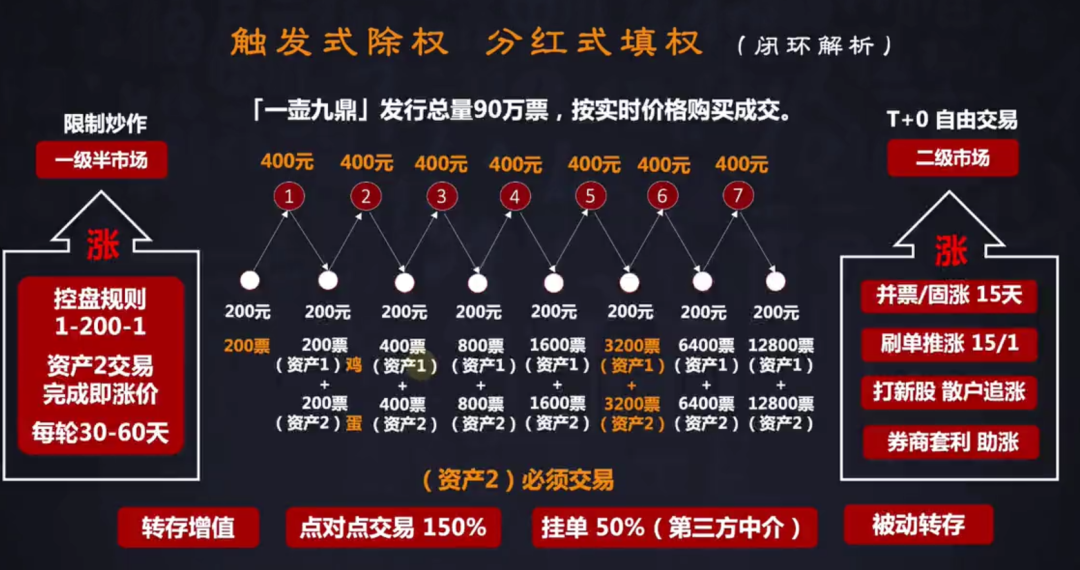 到达400元以后,回落到200元,即除权(10票配10票)。价值减半(200元),票数翻倍(400票。其中,200票,资产一,相当于母鸡,不能卖;200票,资产二,相当于鸡蛋,可以卖,也可以用来“复投”,即转存)。