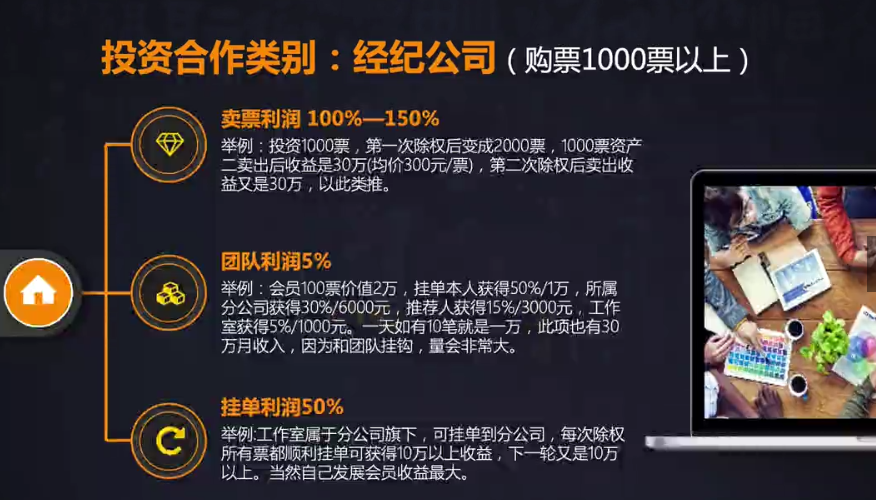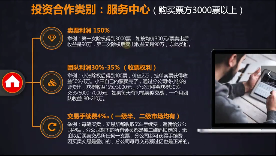 还有更高端的玩法,即服务中心与经纪公司。服务中心(分公司),需要购3000票以上。这里面还有团队计酬、交易手续费等其他利润。