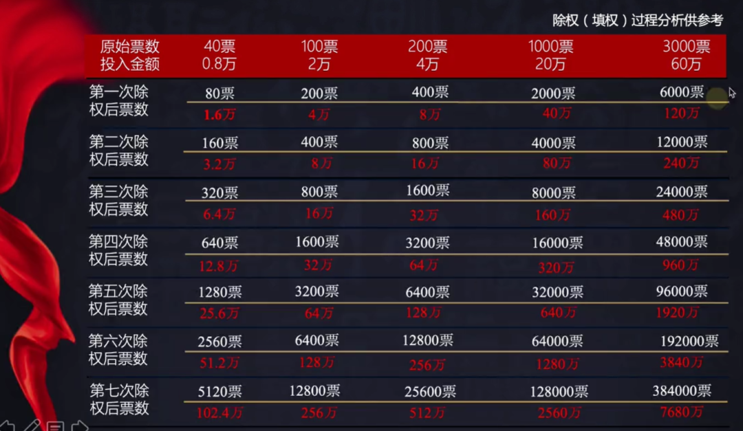 200元的价位涨到400元,过程叫做填权。票数不变(200票),价值翻倍(400元)。