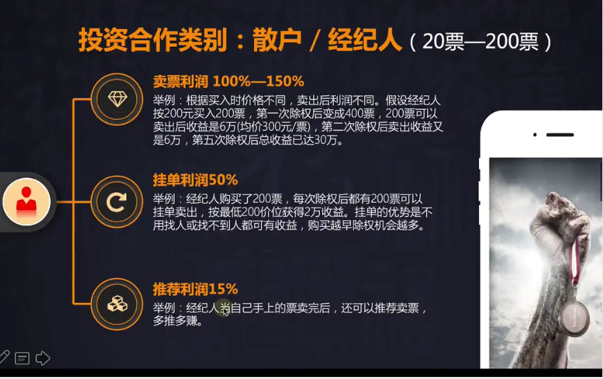 “4-8万元的投资做本钱,每1-2月至少能够产出2-4万元,不少于5次的产出,本钱还在,还可以在二级市场赚钱,你不心动吗?”