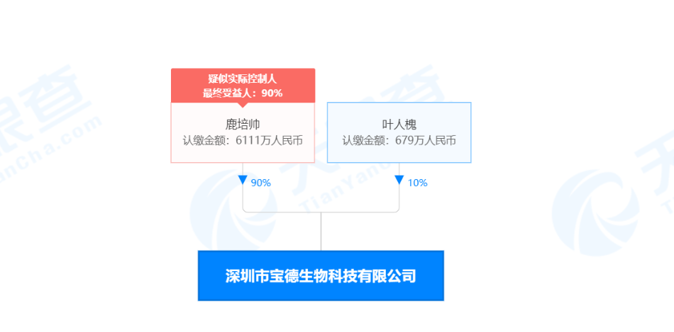 据天眼查APP显示,深圳市宝德生物科技有限公司(以下简称:宝德公司)成立于2017年7月6日,注册资本为6790万元,鹿培帅担任法人、执行董事,总经理,持股90%,叶人槐持股10%。该公司注册的商标“宝露润明”(35-广告销售)“宝露矿泉”“东方宝德”“圣果晶露”“宝露圣泉”显示“商标无效”。