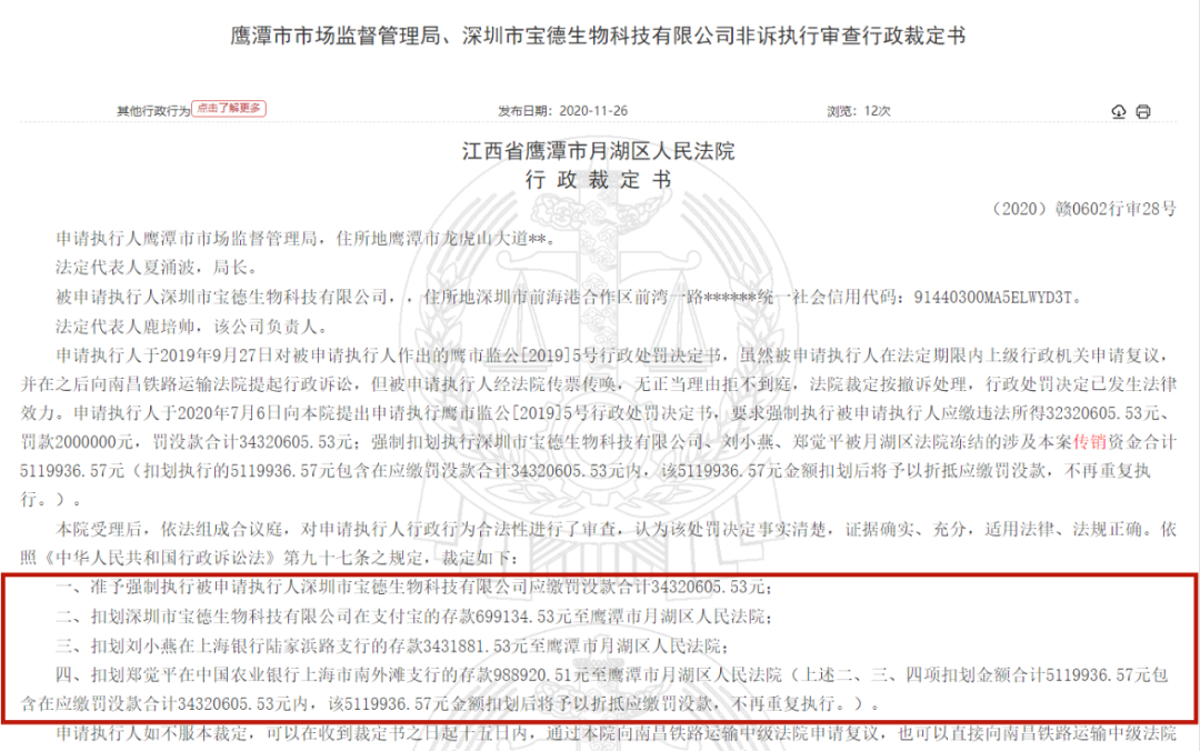 近日,中新观察在中国裁判文书网注意到一则题为《鹰潭市市场监督管理局、深圳市宝德生物科技有限公司非诉执行审查行政裁定书》(以下简称:《行政裁定书》)。