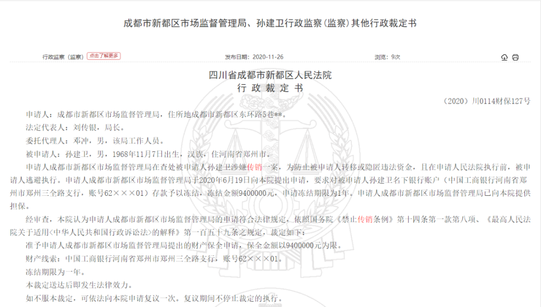 该《行政裁定书》显示,成都市新都区市场监督管理局在查处被申请人孙建卫涉嫌传销一案,为防止被申请人转移或隐匿违法资金,且在申请人民法院执行前,被申请人逃避执行。申请人成都市新都区市场监督管理局于2020年6月19日向本院提出申请,要求对被申请人孙建卫名下银行账户(中国工商银行河南省郑州市郑州三全路支行,账号62×××01)存款予以冻结,冻结金额9400000元,申请冻结期限为1年。申请人成都市新都区市场监督管理局已向本院提供担保。