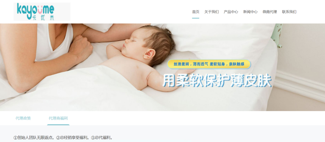 中新观察在“卡优米”官网注意到,婴之源公司采用微商的模式发展市场,其代理政策福利包括:创始人团队无限返点;总经销享受福利;总代福利。(具体福利内容如下图。)
