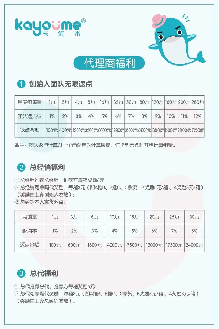 此外,创始人:婴米乐创始人平移,100箱。婴米乐其它级别代理,新品拿货200箱即可成为创始人,并可参加三亚会议,大包一箱4包,小包一箱8包,可以混拿,200箱可以提走100箱,留公司100箱享受公司前期推广的包邮代发。卡优米总经销拿货40箱升级,补货20箱提走10箱,公司包邮10箱代发。