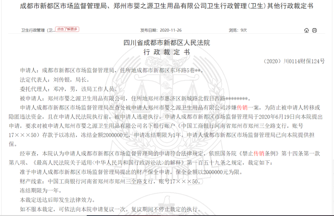 据该《行政裁定书》显示,成都市新都区市场监督管理局在查处被申请人郑州市婴之源卫生用品有限公司涉嫌传销一案,为防止被申请人转移或隐匿违法资金,且在申请人民法院执行前,被申请人逃避执行。申请人成都市新都区市场监督管理局于2020年6月19日向本院提出申请,要求对被申请人郑州市婴之源卫生用品有限公司名下银行账户(中国工商银行河南省郑州市郑州三全路支行,账号17×××50)存款予以冻结,冻结金额2000000元,申请冻结期限为1年。申请人成都市新都区市场监督管理局已向本院提供担保。