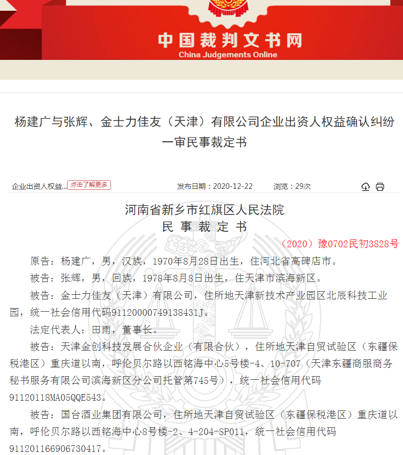 据中国裁判文书网披露的多份民事裁定书显示,9名向河南省新乡市中级人民法院起诉国台酒业的自然人,分别是杨建广、孟庆葛、李泉翰、李达宁、解宏琴、康艳茹、刘淑侠、赵永贵、姜瑞合,诉讼原因都是企业出资人权益确认纠纷。