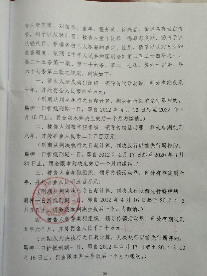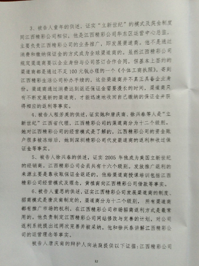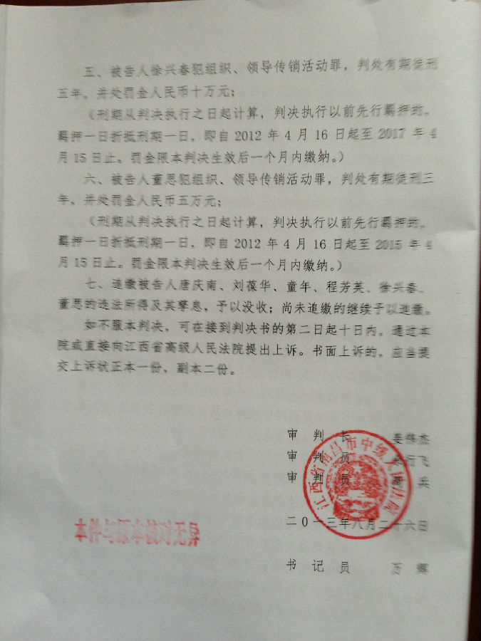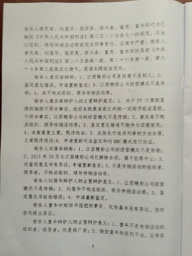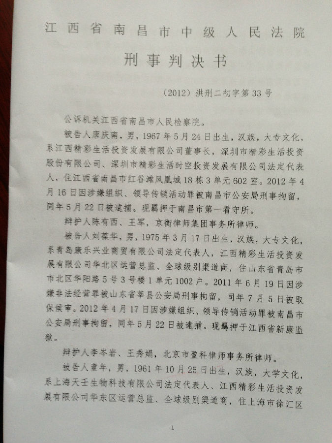 [陈有西按]上午九点半到十点半,江西省南昌市中级法院经过开庭后八个月的等待,终于对目前中国最大的电子商务被控传销案,进行了宣判。去年十二月审判了六天的八名被告人,第七被告刘辉、第八被告王亚亚,检察院撤回起诉,昨天无罪释放。错抓错诉已经确定。第一被告唐庆南,判10年罚金4千万。刘葆华,判8年罚2500万。童年,判6年罚500万。程芳英,判5年半罚20万。徐兴春,判5年罚10万。董思,判3年罚5万。六被告全部不服,当庭表示上诉。现将一审《判决书》公布,请读者结合已经发表的我们各被告律师的无罪《辩护词》,对照研读,便可知一审错判的原因和要点在哪里。晚上我将飞牡丹江办事,在飞机上将对判决进行初步分析。到后将向全国和国外676万太平洋网商,析明我分析的法院裁判要点。上诉书起草中,也将随后公布。二审我们将进一步加强律师辩护力量,继续为太平洋电子商务和唐庆南作无罪辩护。