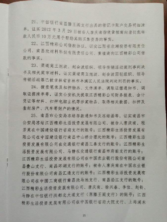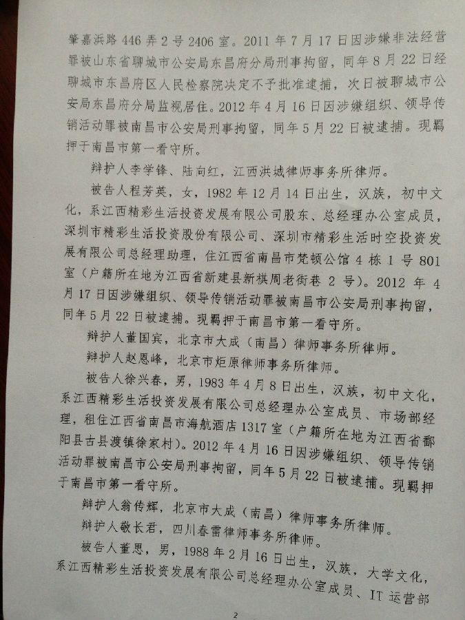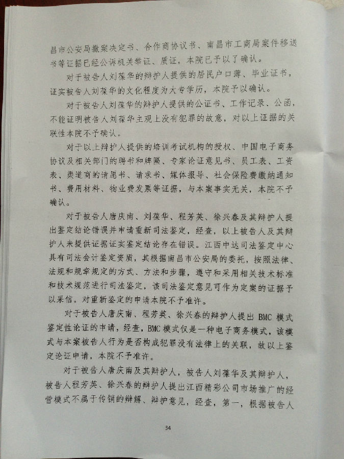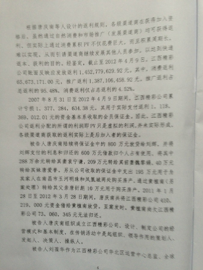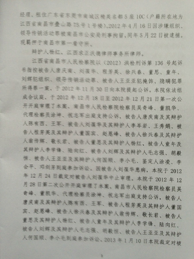 [陈有西按]上午九点半到十点半,江西省南昌市中级法院经过开庭后八个月的等待,终于对目前中国最大的电子商务被控传销案,进行了宣判。去年十二月审判了六天的八名被告人,第七被告刘辉、第八被告王亚亚,检察院撤回起诉,昨天无罪释放。错抓错诉已经确定。第一被告唐庆南,判10年罚金4千万。刘葆华,判8年罚2500万。童年,判6年罚500万。程芳英,判5年半罚20万。徐兴春,判5年罚10万。董思,判3年罚5万。六被告全部不服,当庭表示上诉。现将一审《判决书》公布,请读者结合已经发表的我们各被告律师的无罪《辩护词》,对照研读,便可知一审错判的原因和要点在哪里。晚上我将飞牡丹江办事,在飞机上将对判决进行初步分析。到后将向全国和国外676万太平洋网商,析明我分析的法院裁判要点。上诉书起草中,也将随后公布。二审我们将进一步加强律师辩护力量,继续为太平洋电子商务和唐庆南作无罪辩护。