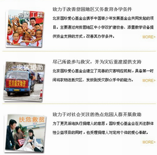 北京国珍爱心基金会坚持公正透明的工作作风,努力以具有公信力的作为和形象推动公益事业发展。截至目前,基金会已先后募集公益资金近1000万元,通过自有的公益渠道以及与中国青少年发展基金会等公益机构的合作,捐往希望小学建设、灾区援建、西部人才培养、弱势群体救助等领域,在社会上引起了广泛的影响。