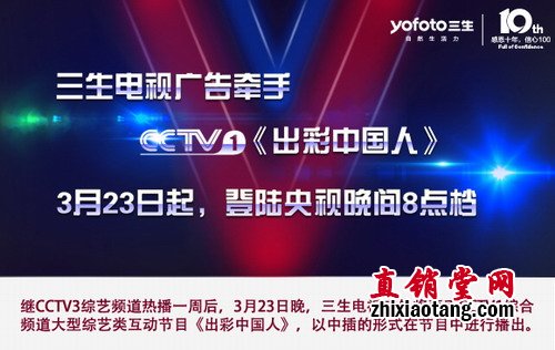 2014年3月17日,三生央视广告在CCTV3综艺频道首播,全面开启2014年三生携手央视的广告合作。在接下来的一年中, 三生广告将在CCTV-1、CCTV-3、CCTV-8 齐登场,全面深化品牌推广,提升公众知名度与影响力,实现三生品牌推广跨跃式升级。 3月23日晚,三生电视广告更将牵手CCTV1综合频道大型综艺类互动节目《出彩中国人》,以中插的形式在节目中进行播出。