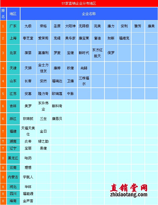 中国57家准直销企业地区分布图