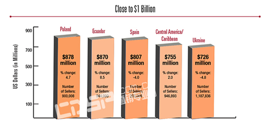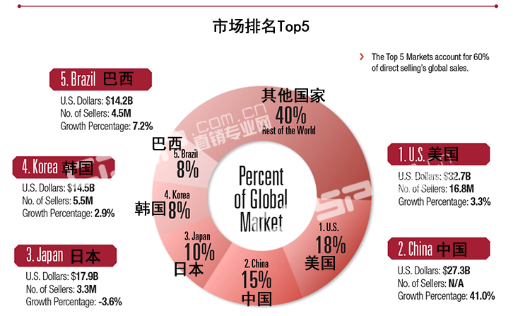 2013年,23个超十亿美元市场中排名前五的国家销售额占全球直销公司销售额的60%。此外,他们大多数还表现出一个积极的年复合增长率:
