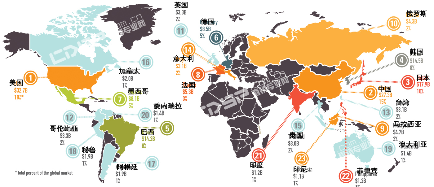 法国:2013年,销售额为53亿美元。2010—2013年间,该国的累计年增长率为3.4%。